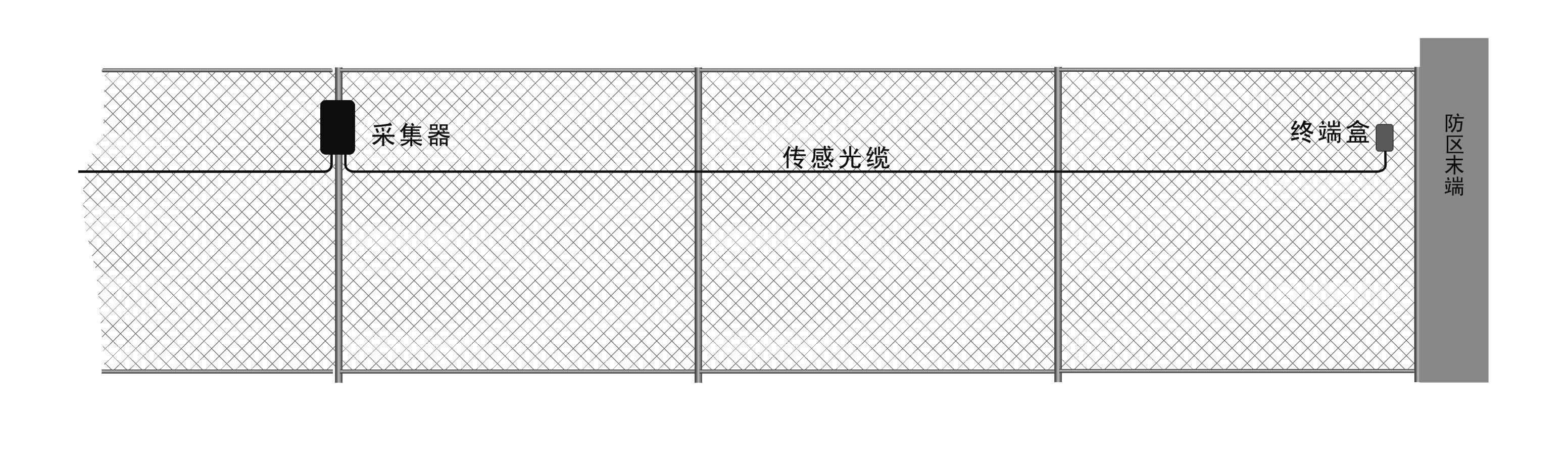 This laying method can detect the invasion of climbing and climbing. Due to the straight-line laying method, less optical cables are needed, so it is suitable for places with low alert level. The sensing optical cable should be laid at about 3/4 of the height of the iron net, and laid in a horizontal straight line. The optical cable and the iron net grid should be tightly fixed with anti-ultraviolet tie or special binding tape every 40cm, as shown in the figure.